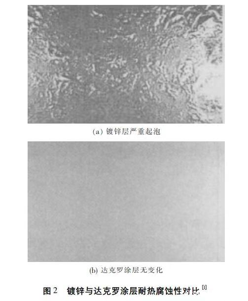 2) 耐热蚀性能高。 达克罗涂层是在 300 ℃ 条件下烧结形成的,能够满足较高温环境下长期使用且保持外观基本不变,并具有良好的耐腐蚀性能。经钝化处理后的镀锌层,在较高的温度下钝化膜( xCr2O3 ·yCrO3 ·zH2O) 失去结晶水,在 70 ℃时钝化层会产生网状龟 裂,200 ~ 300 ℃ 时表面颜色变灰白,并开始产生锈蚀,耐腐蚀性能严重降低。耐热蚀性对比如图 2 所示[1]。