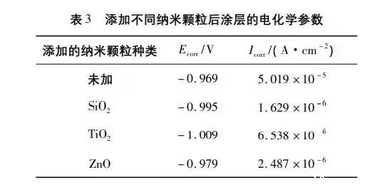 朱俊谋等[26]研究了 ZnO、TiO2 和 SiO2 这 3 种 纳米微粒对无铬达克罗涂层耐蚀性能的影响。研 究证实: 3 种无铬纳米复合涂层的耐蚀性均会优于 不含纳米微粒的无铬锌铝涂层,其耐盐水浸泡时间 ( 以出现红锈为衡量点) 分别为 SiO2 ( 84 d) > TiO2 ( 83 d) > ZnO( 78 d) > 不含纳米微粒无铬达克罗 涂层( 75 d) 。含纳米微粒的无铬达克罗涂层对基体 的保护作用主要表现在 2 个方面: ①纳米微粒的加 入能够起到细晶强化的作用,可使膜层组织均匀而 致密,且可提高 Al 的活度,使其在局部区域能够生 成单一的氧化铝膜,从而能很大程度地提高其抗腐 蚀性能,最终达到能使涂层在腐蚀环境中长时间工 作的效果; ②涂层中的纳米微粒不仅会分散在锌铝 粉的缝隙中,还会覆盖在片状锌铝粉的表面上,这 能够有效抑制电极表面上去极化剂的去极化作用, 从而降低腐蚀电流密度,在这种阴极保护作用下, 锌铝粉在腐蚀介质中的腐蚀消耗速率被降低,最终 达到延缓基体腐蚀的目的。其极化曲线、电化学参 数分别见图 5、表 3。